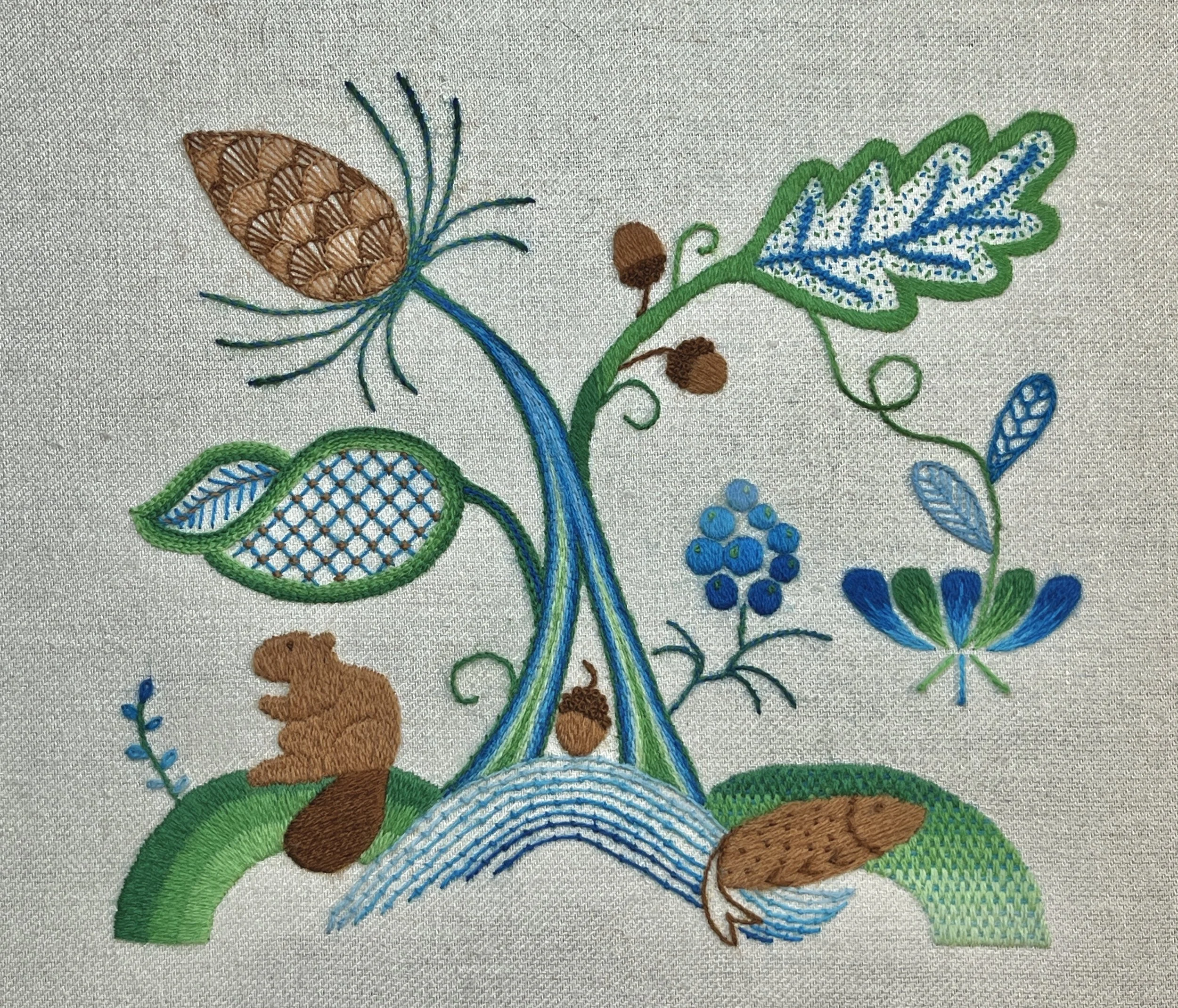 In the fall of 2023, I started the first module of the Royal School of Needlework certificate, which focuses on Jacobean Crewelwork Embroidery. This style of embroidery originated in England in the early 17th century and uses wool yarn on linen cloth. Motifs are nature-themed and objects are disproportionate.