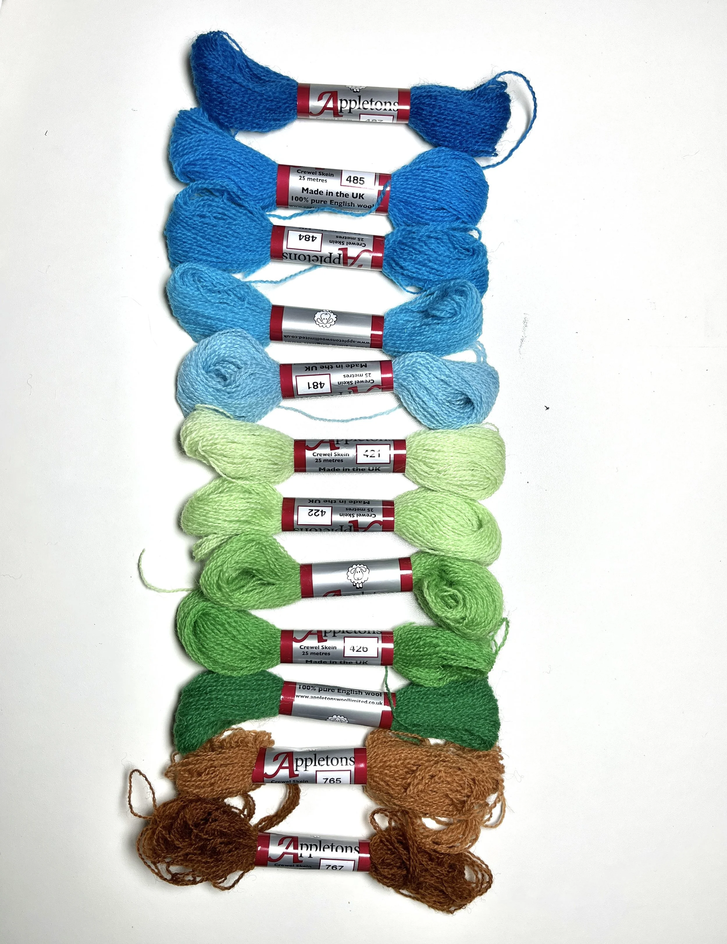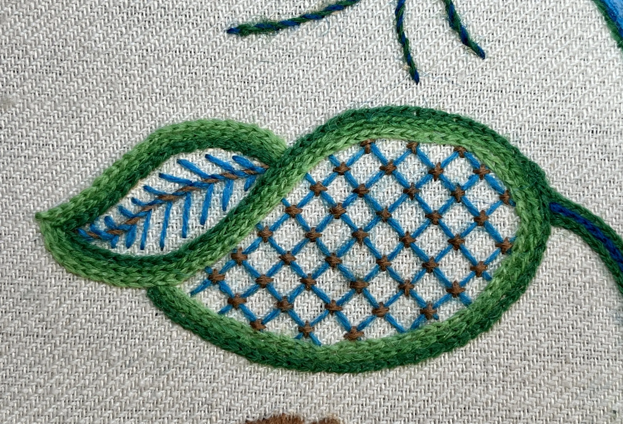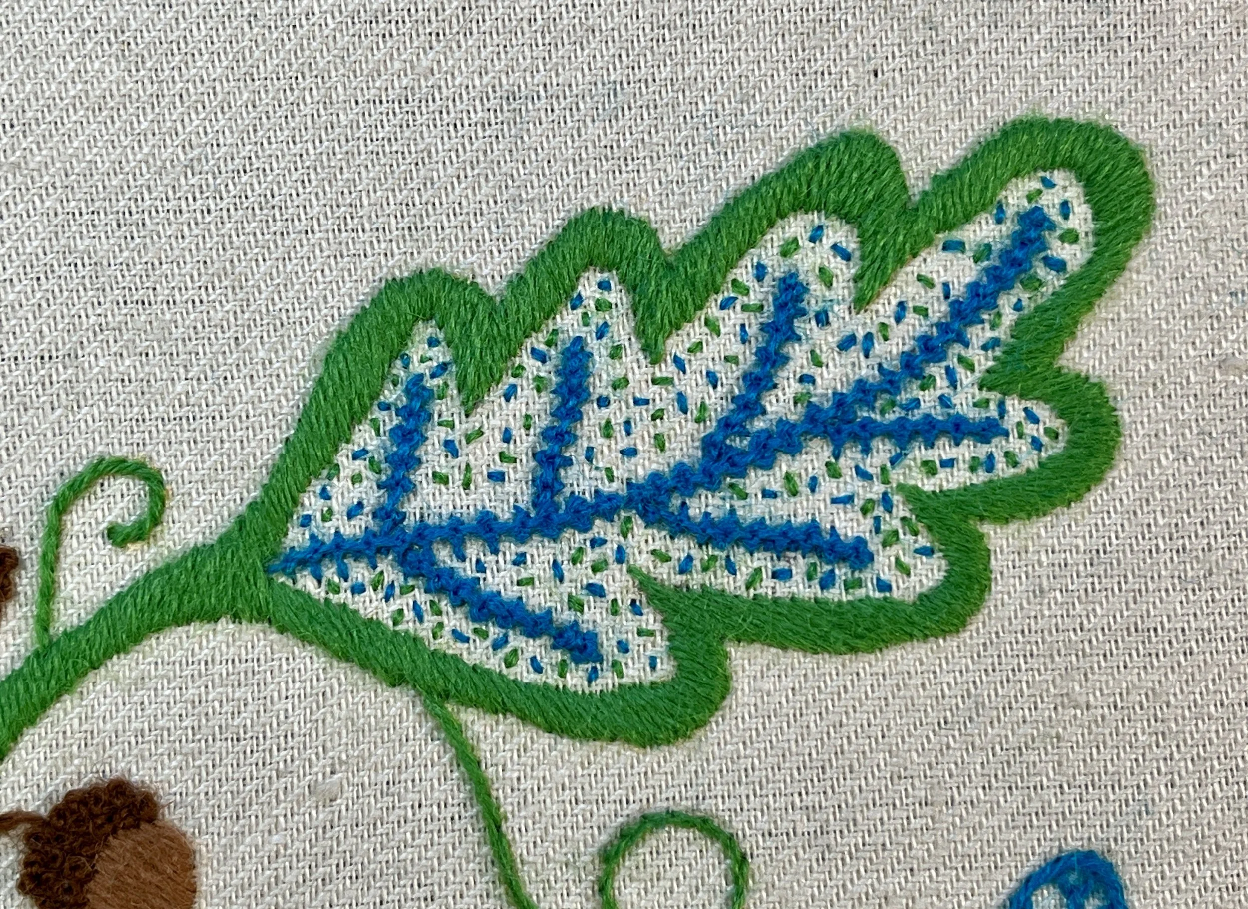 Our brief instructed us to include a minimum of 14 crewelwork stitches from four categories: outline, fill, texture, and accent. We were to use 2 primary color families of Appleton crewel wool, with 5 hues each, preferably from the same number range. An additional accent color with two hues was also a requirement.